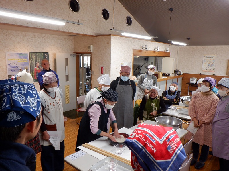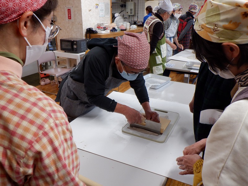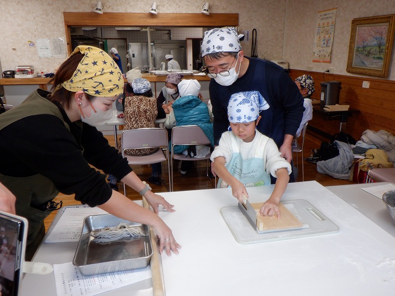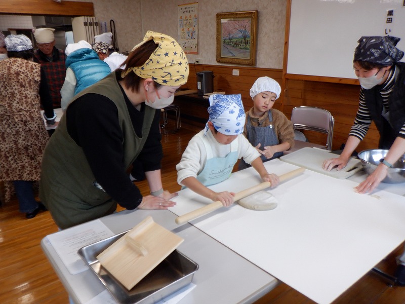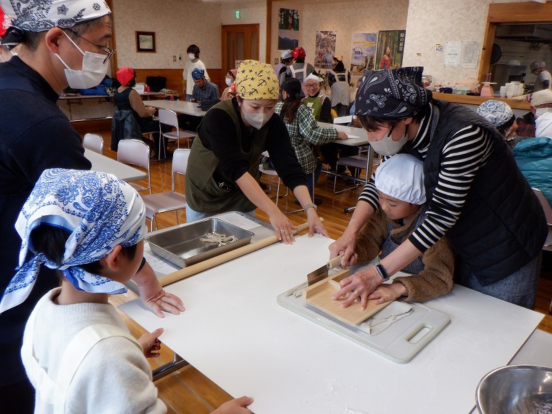 2026年1月26日1月25日(日曜日)に、「そば打ち体験教室」を開催したところ、大変寒い日でしたが総勢34名の方が参加してくださいました。講師の先生によるそば粉の混ぜ方から切り方までの実演の後、それぞれグループごとに分かれてそば打ちに挑戦しました。皆さんそば粉のこね方、延ばし方に四苦八苦しながらも和気あいあいと楽しんでいました。