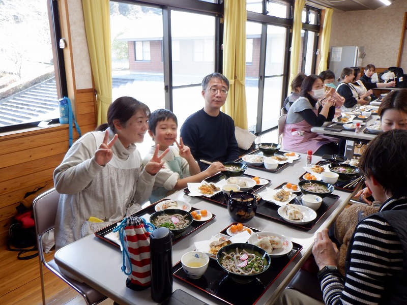 そば打ちを体験した後は、自分達で打ったそばを天ぷらやおにぎりちらしと一緒に食し、格別な美味しさに大満足そうで、また来年も是非参加したいと大好評でした。