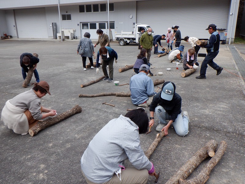 この日はこの時期には珍しくとても暑い天気の中、電動ドリルを使ってのしいたけ原木の穴開けや種駒を金槌で打ち込んだり、原木を運んだりの作業を参加者皆さんで協力しながら作業を楽しんでいただきました。